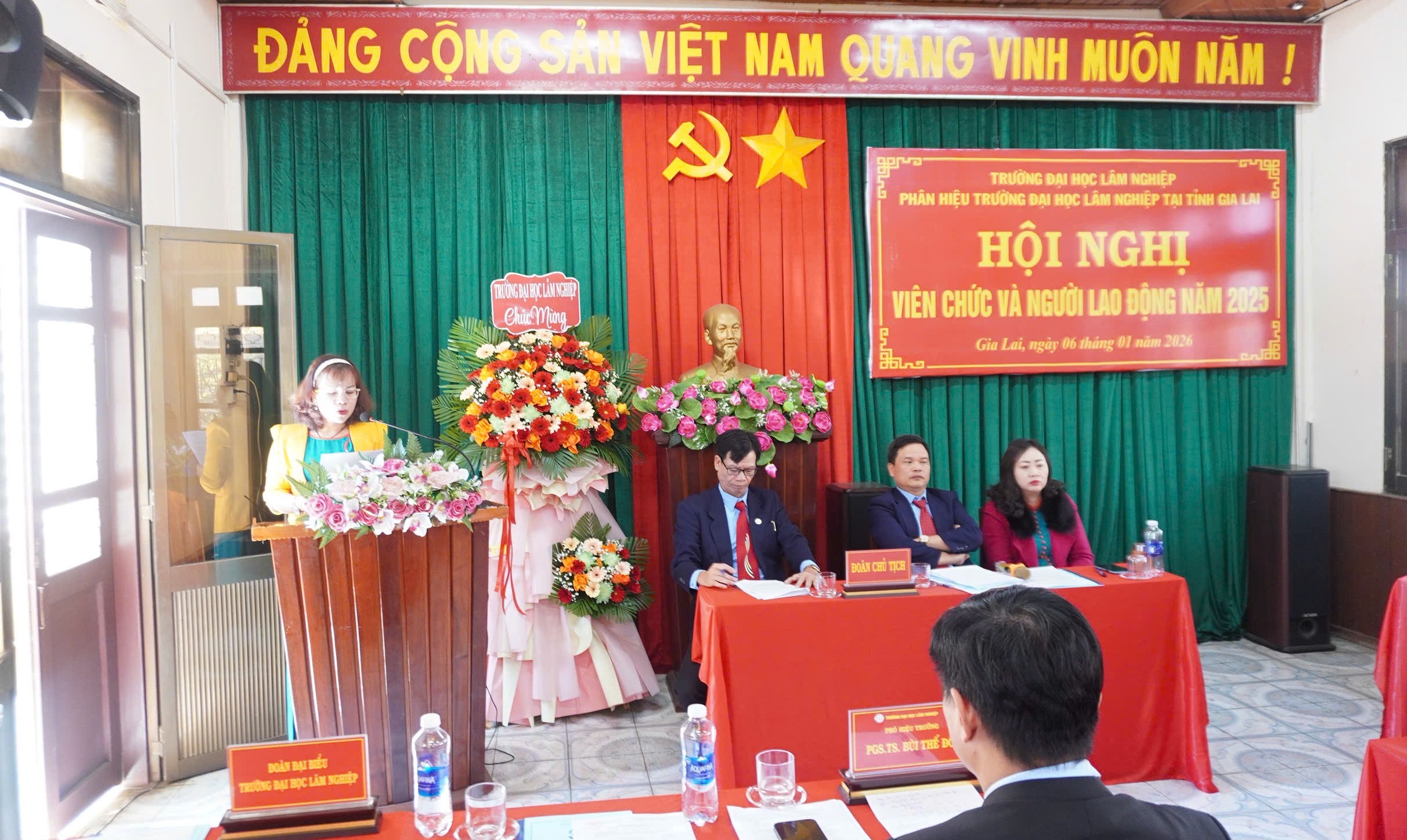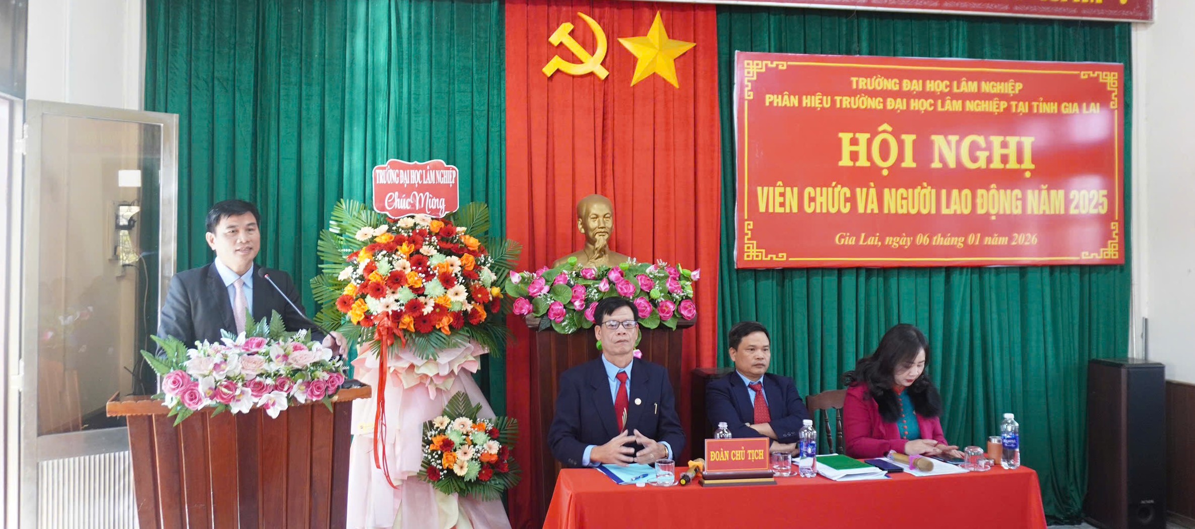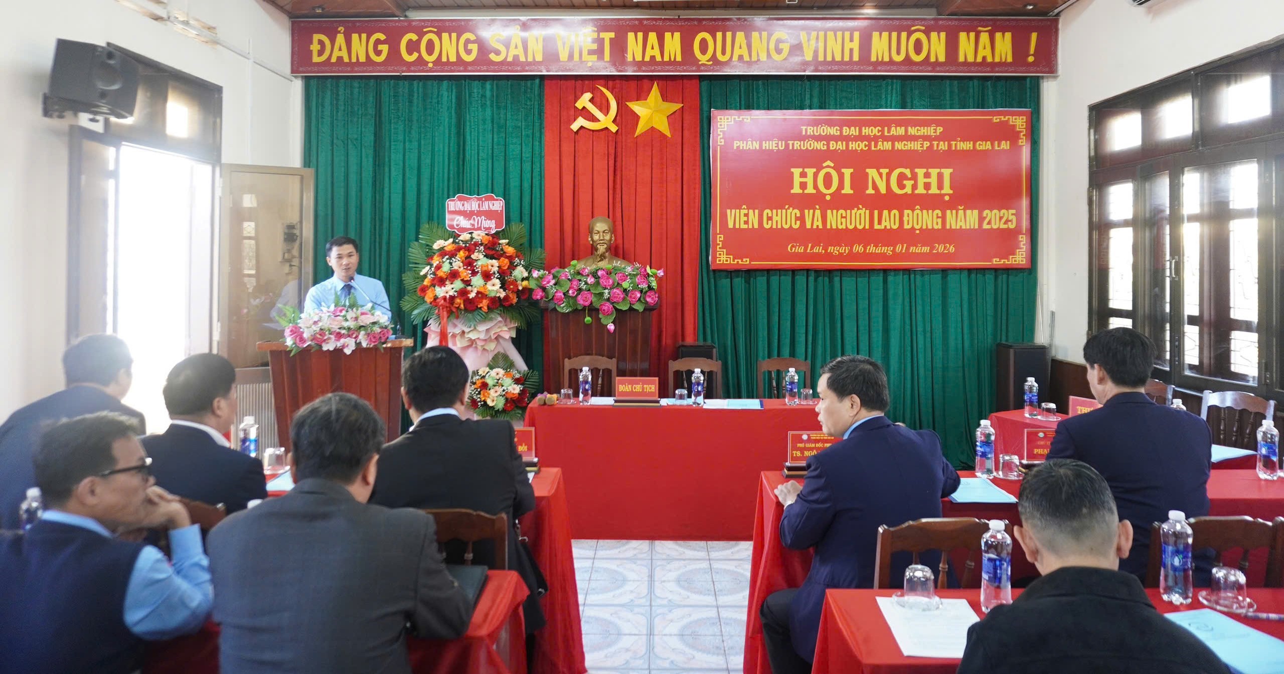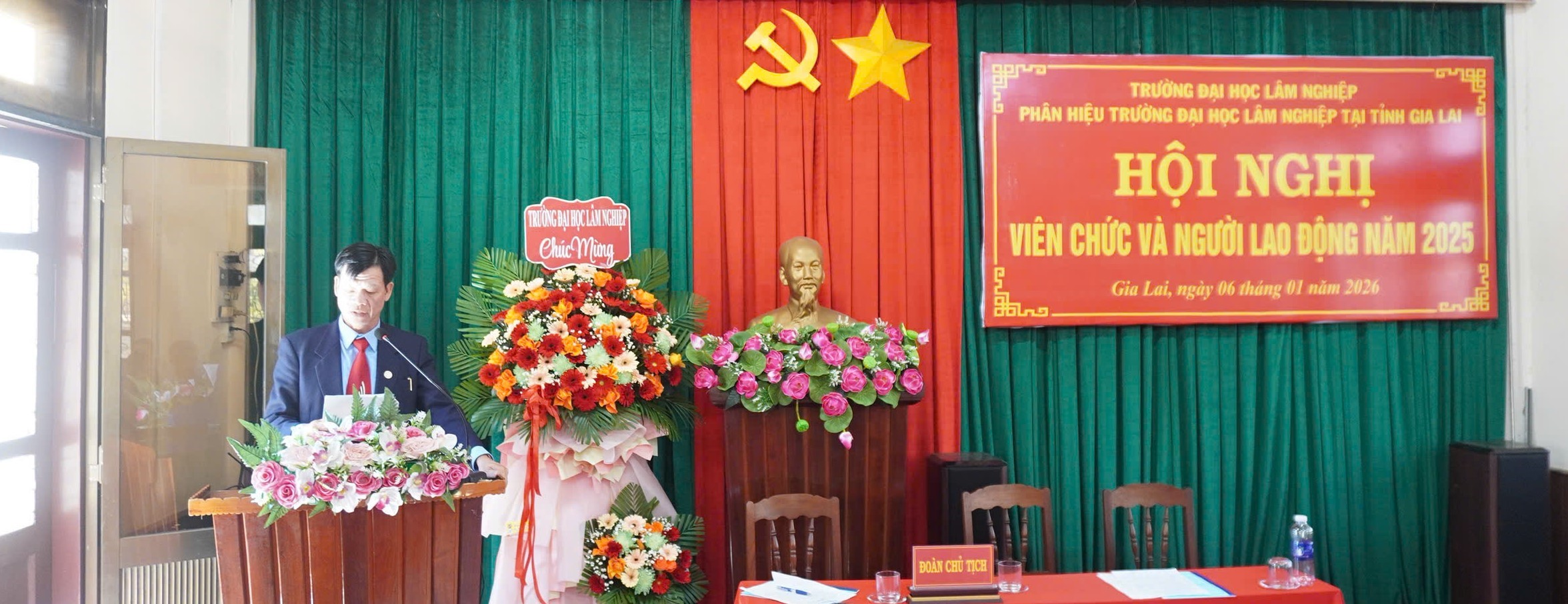 Ngày 06/01/2026, Phân hiệu Trường Đại học Lâm nghiệp tại tỉnh Gia Lai (Phân hiệu) đã long trọng tổ chức Hội nghị viên chức (VC), người lao động (NLĐ) năm 2025. Hội nghị là dịp quan trọng để nhìn lại một năm đầy nỗ lực với những kết quả đáng ghi nhận, đồng thời thảo luận và thông qua những phương hướng, nhiệm vụ trọng tâm cho năm 2026, mở ra chương mới trong hành trình phát triển của Phân hiệu.