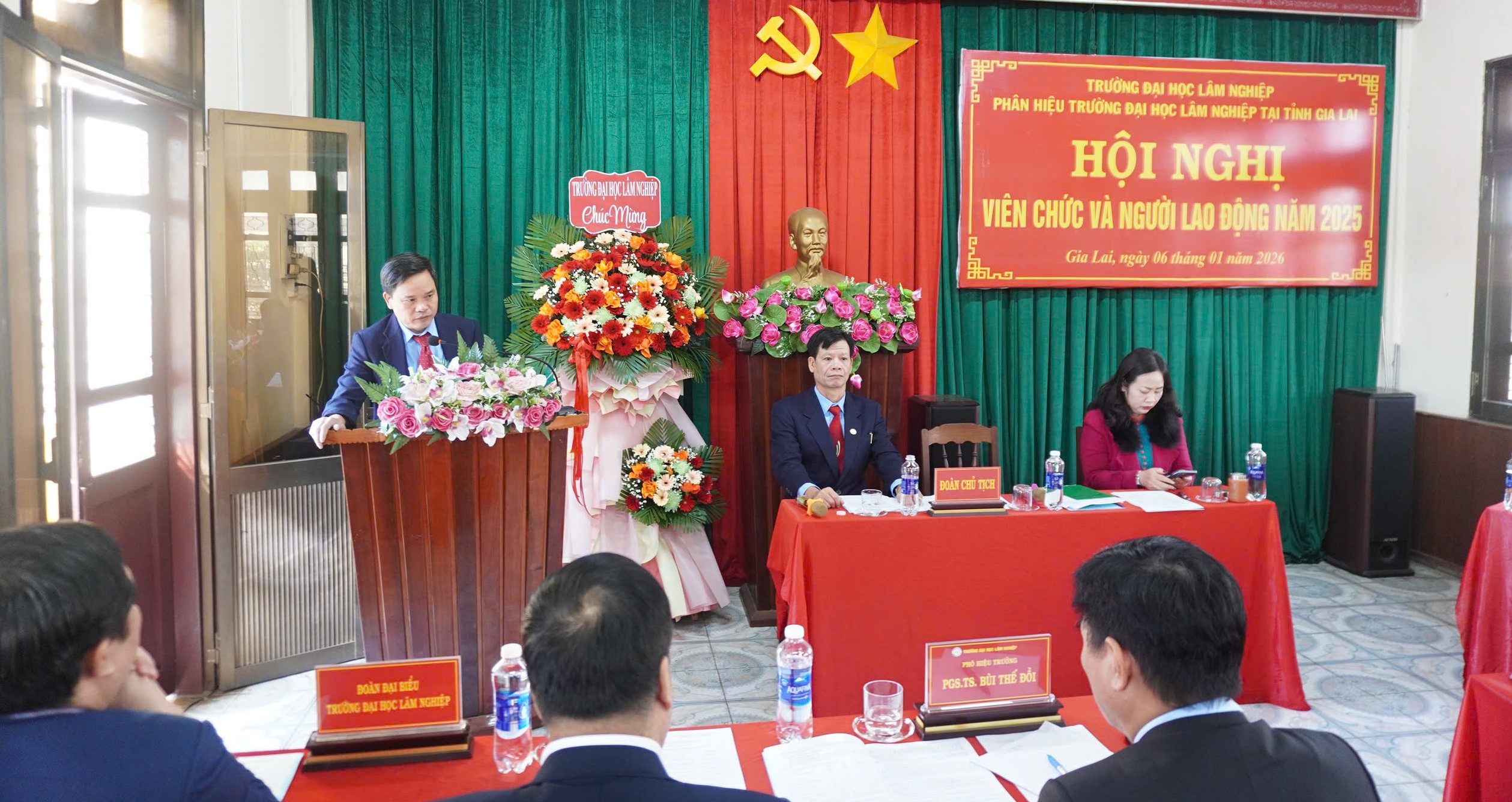 Thay mặt Lãnh đạo Trường Đại học Lâm nghiệp, PGS.TS Bùi Thế Đồi, Phó Hiệu trưởng, Chủ tịch Công đoàn Trường ĐHLN đã phát biểu chỉ đạo Hội nghị, Thầy ghi nhận và biểu dương những nỗ lực vượt bậc của tập thể Phân hiệu trong bối cảnh nhiều khó khăn, thách thức như: Công tác tuyển sinh đại học chính quy đạt 110% chỉ tiêu, khẳng định uy tín và vị thế của Phân hiệu tại khu vực Tây Nguyên. Hoạt động đào tạo được duy trì ổn định với 06 ngành học. Công tác tổ chức - nhân sự bảo đảm đoàn kết, ổn định, với khoảng 95% viên chức hoàn thành tốt nhiệm vụ trở lên. Công tác quản lý tài chính, tài sản được thực hiện chặt chẽ theo cơ chế tự chủ, bảo đảm đầy đủ chế độ, chính sách cho người lao động; đặc biệt, việc quản lý, bảo vệ rừng tại Trung tâm Thực nghiệm Mang Yang có nhiều cố gắng trong điều kiện còn phức tạp. Tuy nhiên, bên cạnh những kết quả tích cực nêu trên, bài phát biểu cũng thẳng thắn chỉ rõ các hạn chế cần sớm khắc phục…