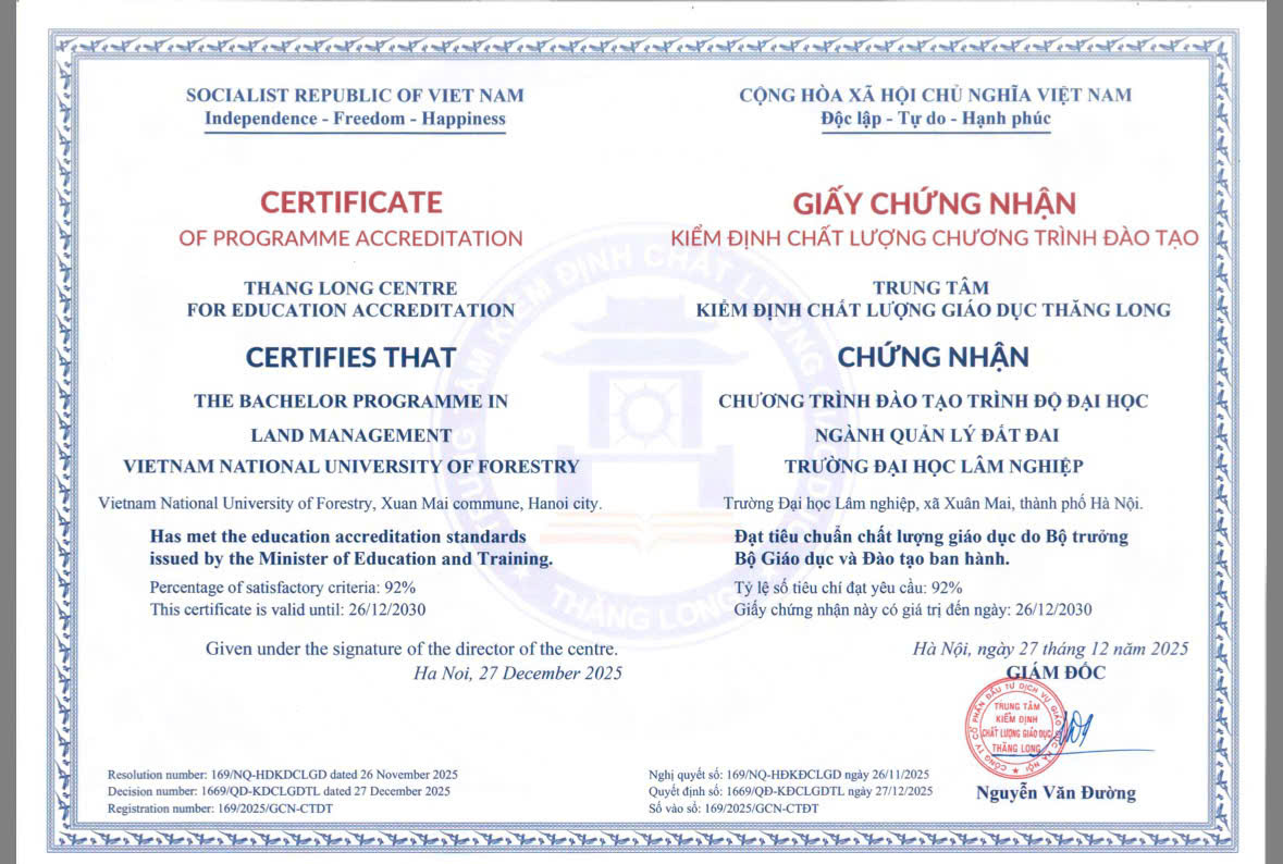 Tháng 12/2025, Trường Đại học Lâm nghiệp (VNUF) tiếp tục ghi dấu ấn quan trọng trong lộ trình nâng cao chất lượng giáo dục đại học khi vinh dự đón nhận thêm 06 Giấy chứng nhận kiểm định chất lượng chương trình đào tạo - đạt kiểm định chất lượng cơ sở giáo dục chu kỳ 2 (2023-2028). Kết quả này nâng tổng số chương trình đào tạo của Nhà trường được đánh giá và chứng nhận kiểm định trong năm 2025 lên 10 chương trình, qua đó khẳng định rõ nét định hướng phát triển bền vững, lấy chất lượng làm nền tảng cốt lõi và chủ động hội nhập quốc tế.