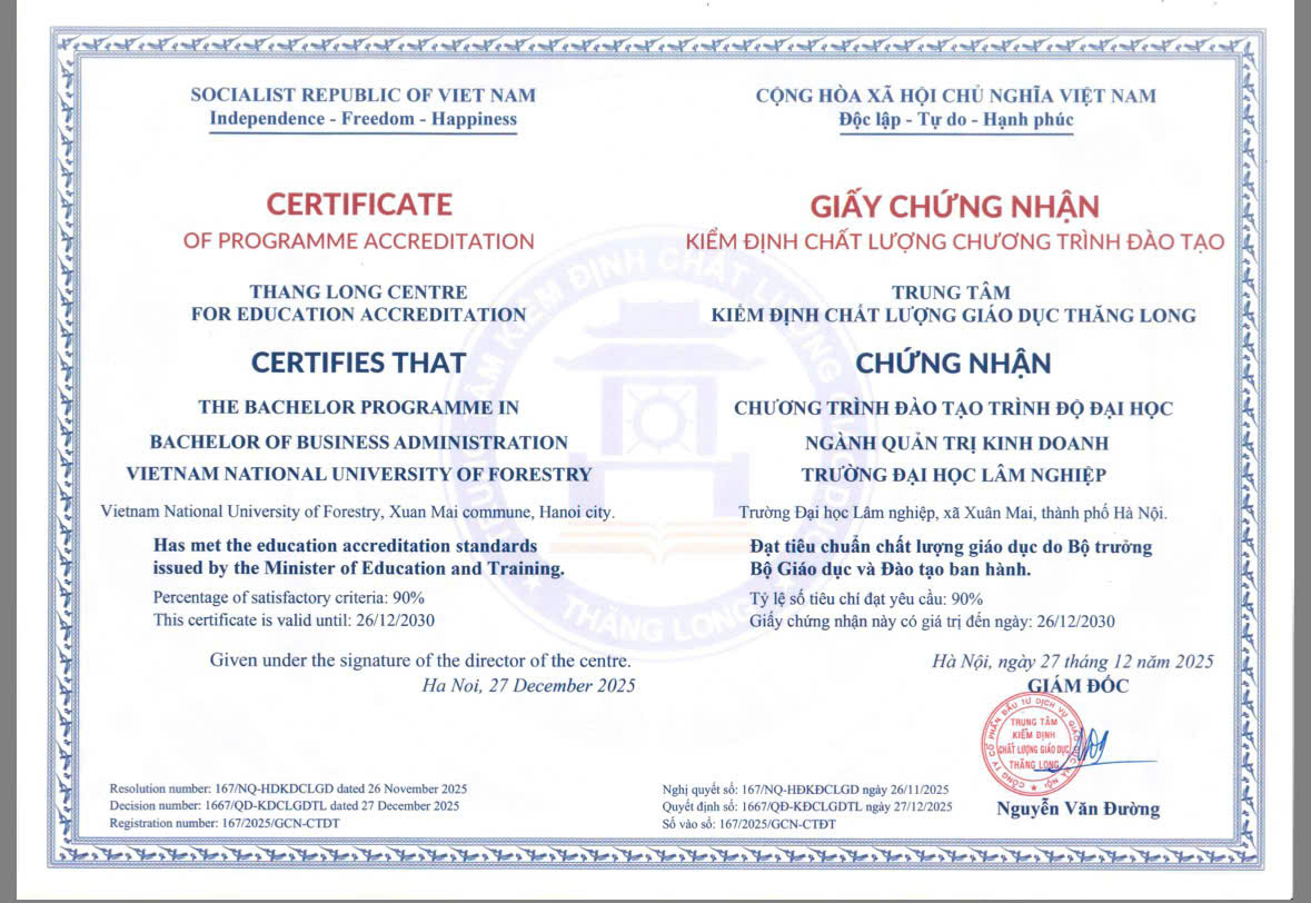 Trong đợt đánh giá lần này, VNUF có thêm 06 chương trình đào tạo trình độ đại học đạt chuẩn kiểm định chất lượng do Trung tâm Kiểm định chất lượng giáo dục Thăng Long cấp. Các chương trình được công nhận bao gồm: Công nghệ kỹ thuật ô tô, Công nghệ kỹ thuật cơ điện tử, Kiến trúc cảnh quan, Quản lý đất đai, Quản lý tài nguyên rừng và Quản trị kinh doanh. Đây đều là những ngành đào tạo có nhu cầu xã hội cao, gắn chặt với định hướng phát triển kinh tế – xã hội và yêu cầu thực tiễn của thị trường lao động hiện nay.