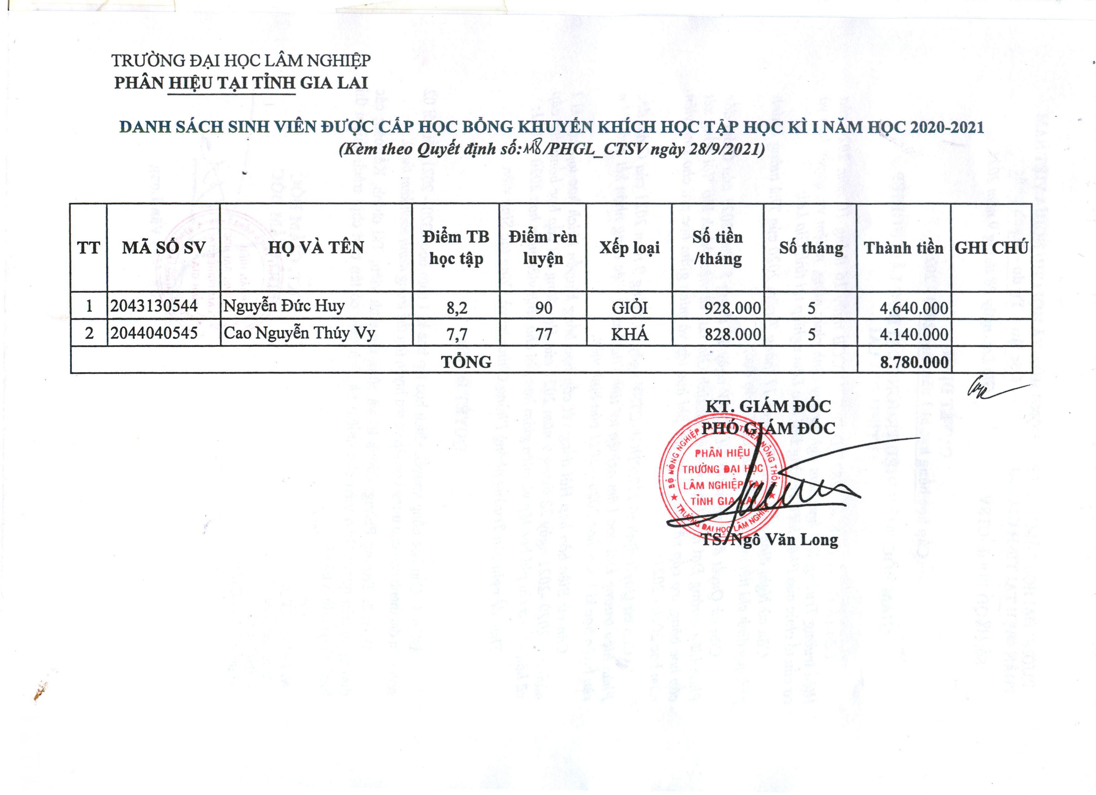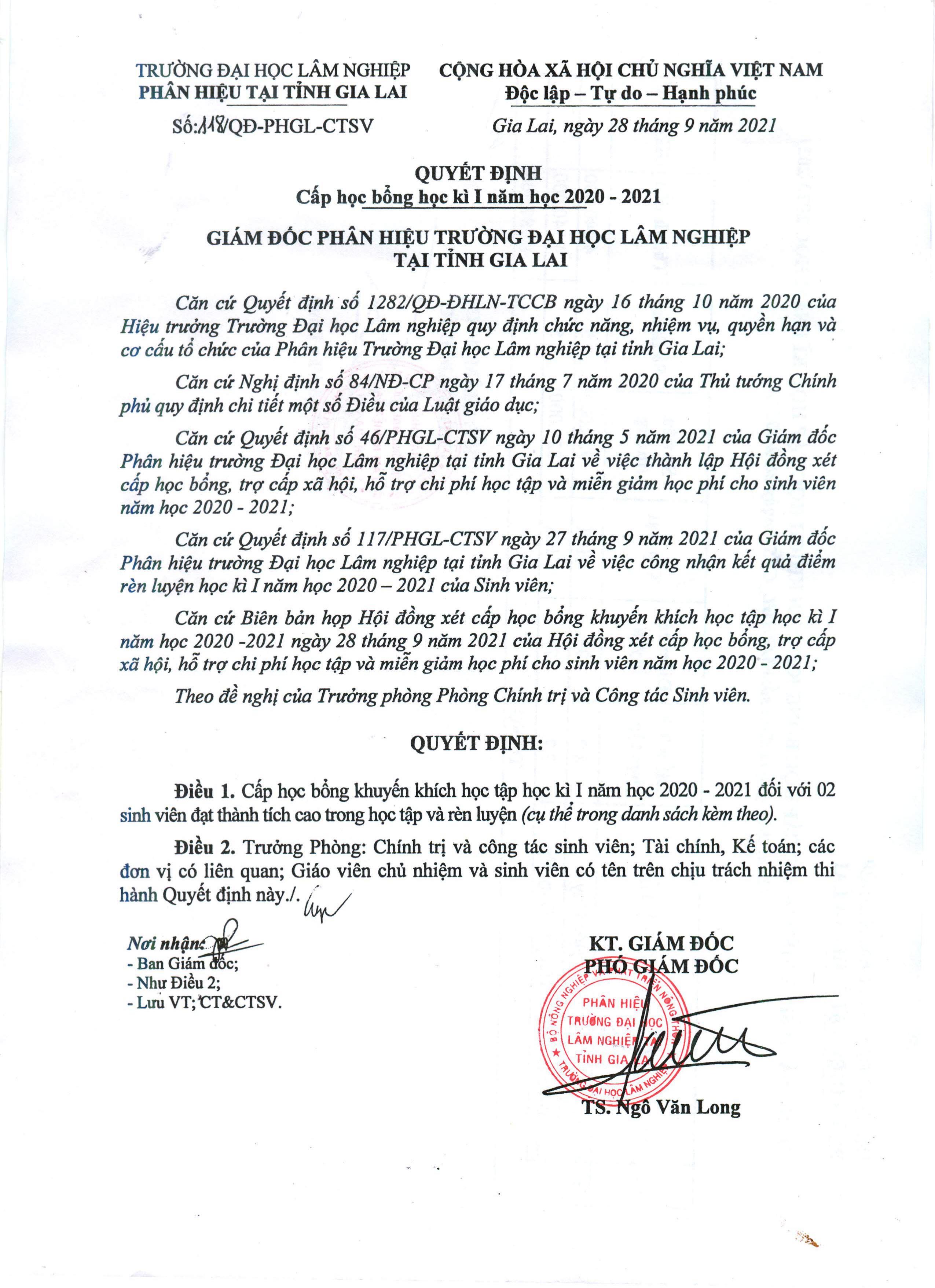 Quyết định Cấp học bổng học kì I năm học 2020-2021