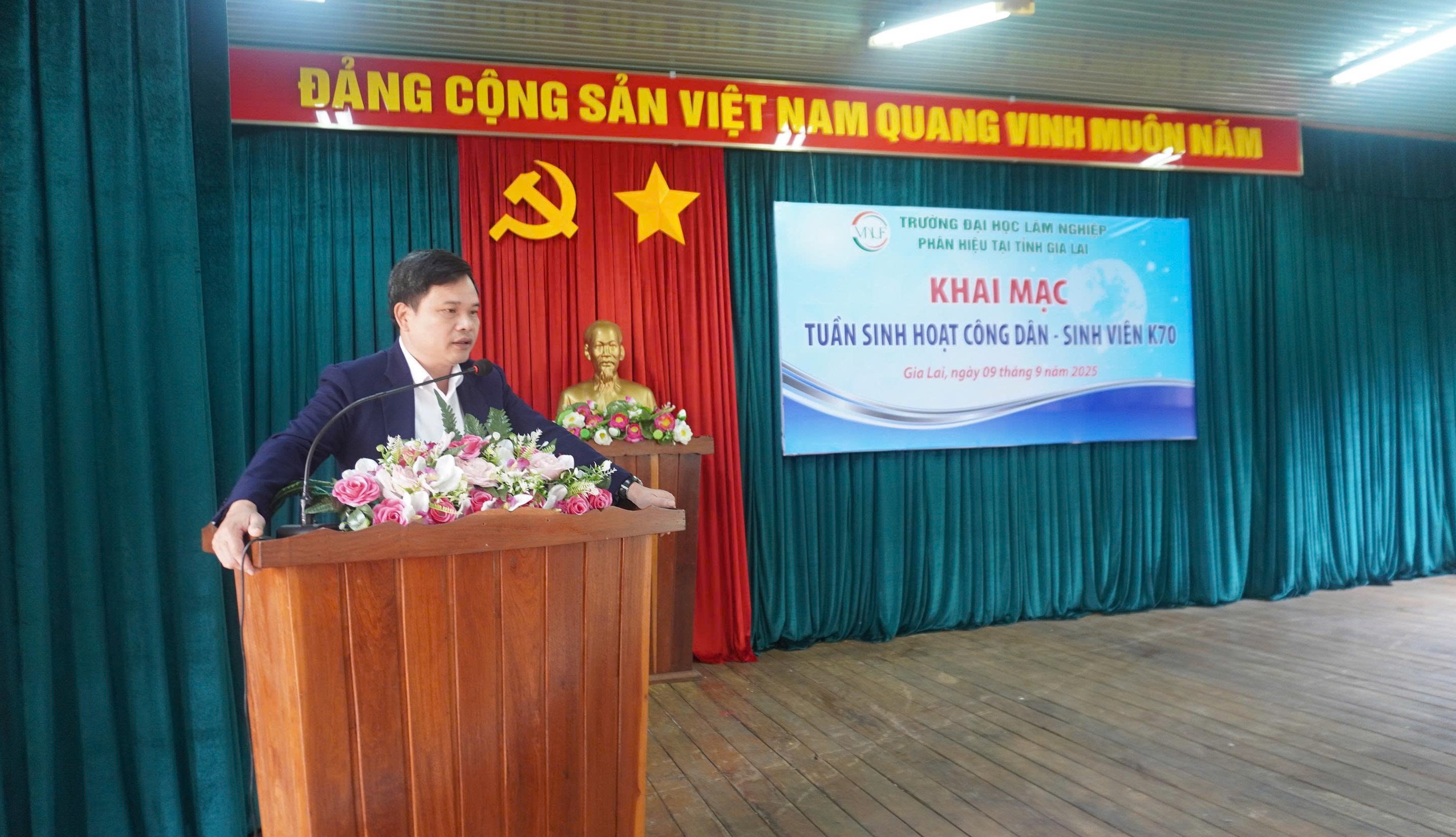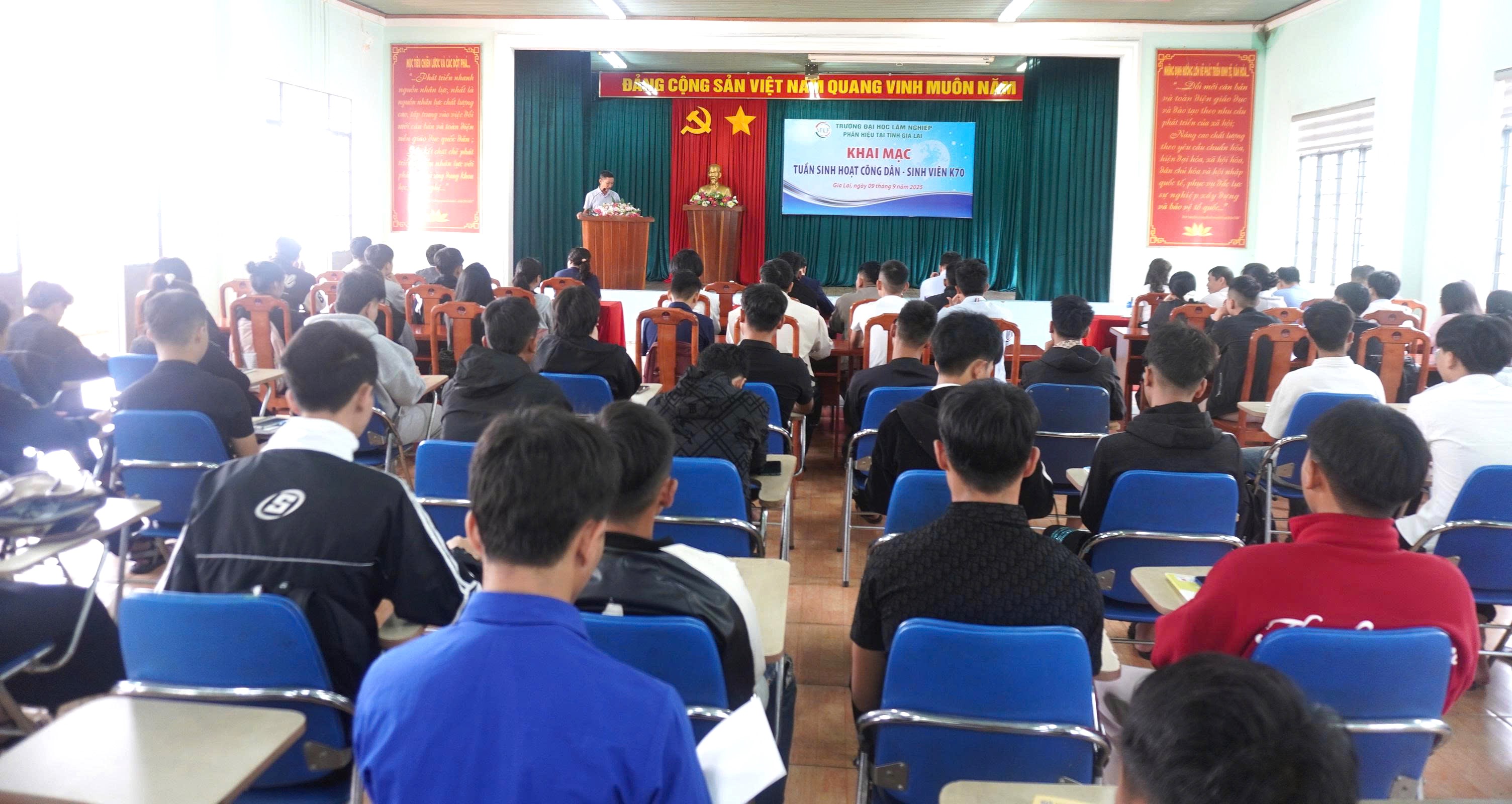 Sáng ngày 09/9/2025, Phân hiệu Trường Đại học Lâm nghiệp (ĐHLN) tại tỉnh Gia Lai long trọng tổ chức Lễ khai mạc Tuần sinh hoạt công dân - sinh viên đầu khóa dành cho tân sinh viên khóa 70 tại Hội trường lớn. Đây là hoạt động chính trị quan trọng, mở đầu hành trình học tập và rèn luyện của các em tại mái trường đại học, góp phần trang bị những kiến thức nền tảng về đường lối, chủ trương của Đảng, chính sách pháp luật của Nhà nước, đồng thời phổ biến quy chế, nội quy và những vấn đề cốt lõi trong đời sống sinh viên.