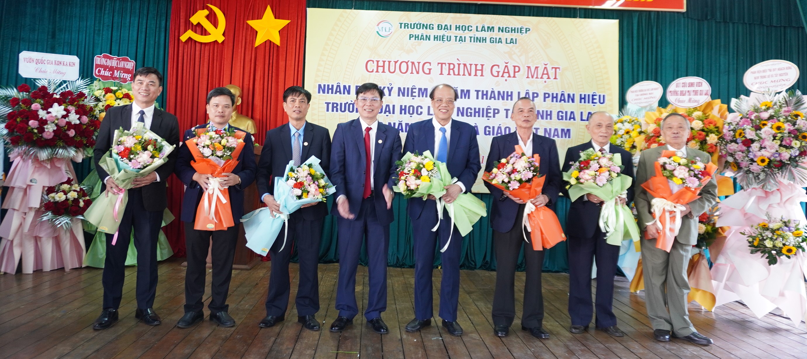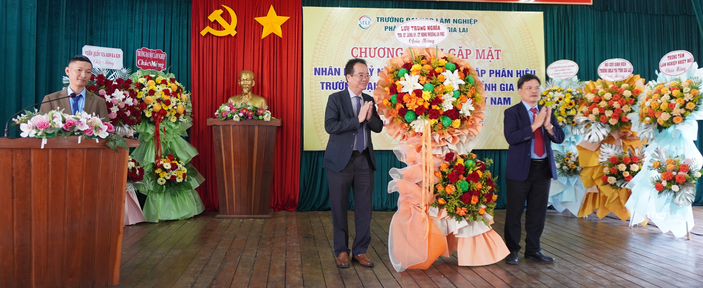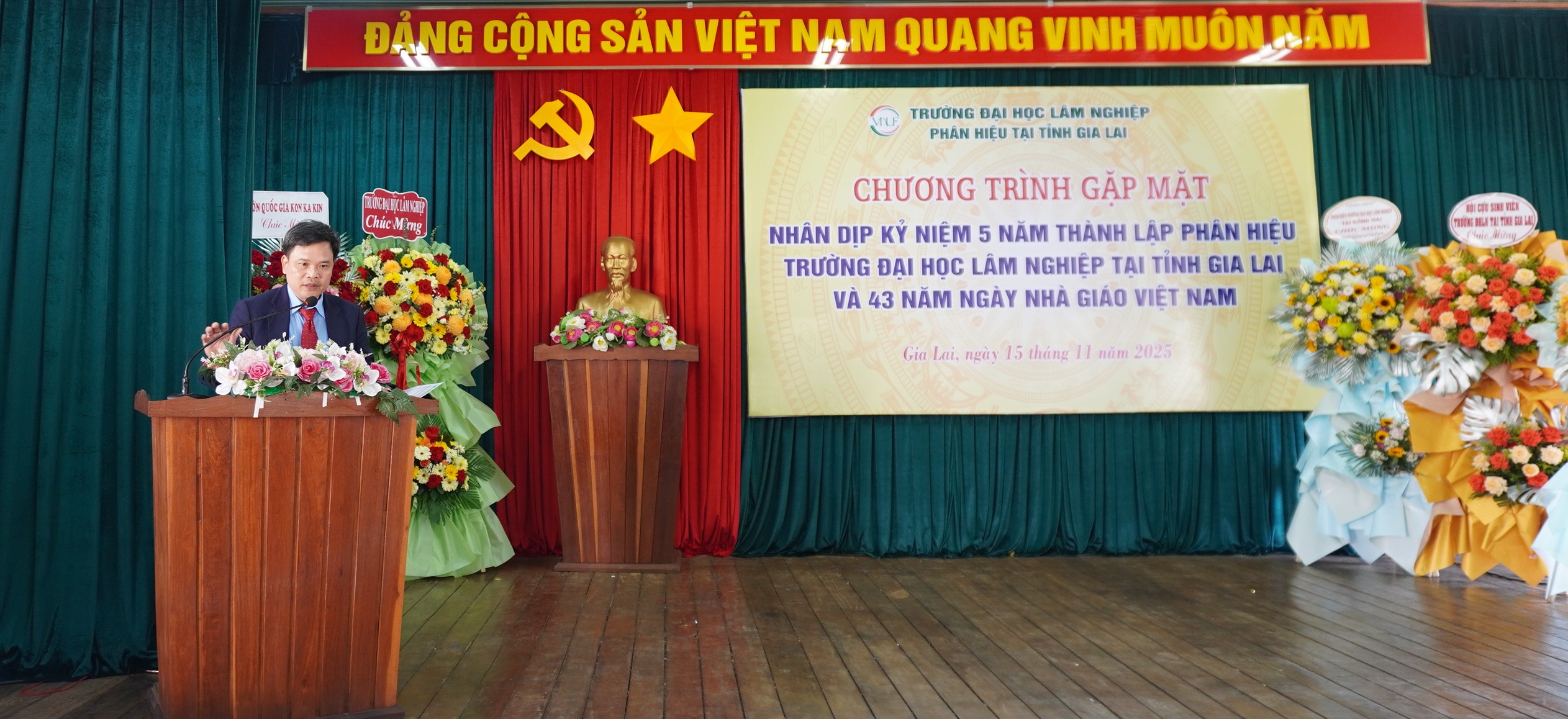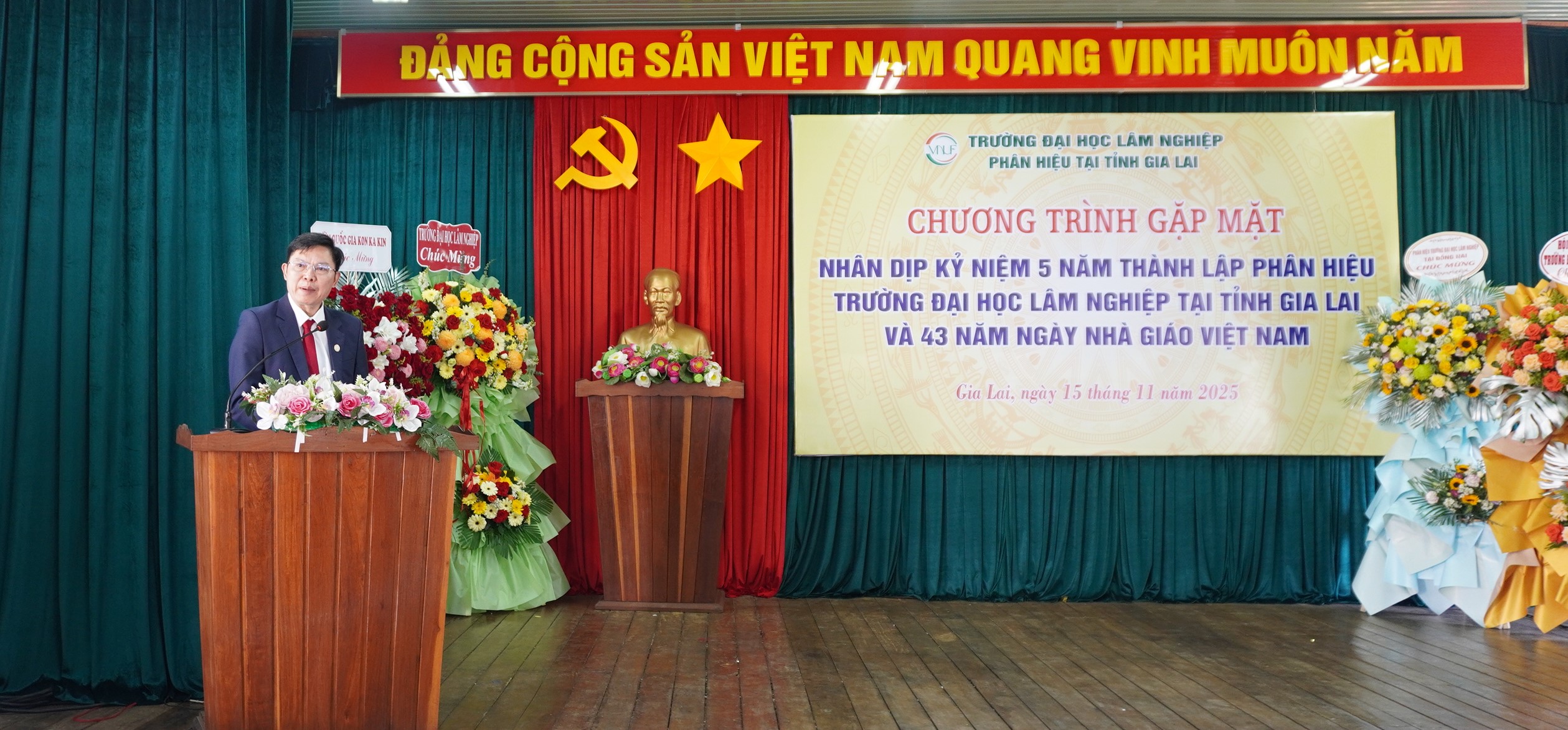 Cũng tại buổi Lễ, thay mặt Lãnh đạo Trường Đại học Lâm nghiệp, NGƯT. GS. TS. Phạm Văn Điển, Hiệu trưởng nhà trường đã tặng lẵng hoa và ủng hộ quỹ khuyến học, khuyến tài của Phân hiệu 20.000.000 đồng; Trong bài phát biểu nhân dịp Kỷ niệm Phân hiệu Trường Đại học Lâm nghiệp tại Gia Lai tròn 05 năm thành lập và chào mừng Ngày Nhà giáo Việt Nam 20/11, Thầy nhấn mạnh, trong không khí tri ân tháng Mười Một, buổi lễ trở thành dịp để nhìn lại chặng đường hình thành, phát triển và tri ân những đóng góp bền bỉ của bao thế hệ, khẳng định hành trình đi lên của Phân hiệu: từ nền tảng Trường Trung cấp Lâm nghiệp Tây Nguyên, đơn vị đã từng bước vươn lên mạnh mẽ, khẳng định vai trò đào tạo nguồn nhân lực chất lượng cao cho Tây Nguyên và Nam Trung Bộ, cũng như mở rộng hợp tác với doanh nghiệp, cơ quan quản lý và các tổ chức quốc tế. Không chỉ vậy, sự đồng hành của chính quyền, cộng đồng và cựu sinh viên đã tạo nên sức mạnh giúp Phân hiệu không ngừng lớn mạnh. Đồng thời, đây cũng là dịp để tri ân sâu sắc các thế hệ thầy cô - những người âm thầm gìn giữ và truyền lửa tri thức. Dưới sự bảo trợ của Trường Đại học Lâm nghiệp - đại học đa ngành uy tín hơn 60 năm - Phân hiệu tại tỉnh Gia Lai tiếp tục hướng đến mục tiêu đổi mới, hội nhập, trở thành trung tâm tri thức xanh của Tây Nguyên. Vì vậy, buổi lễ là lời khẳng định niềm tự hào, sự biết ơn và khát vọng vươn xa trong chặng đường mới.
