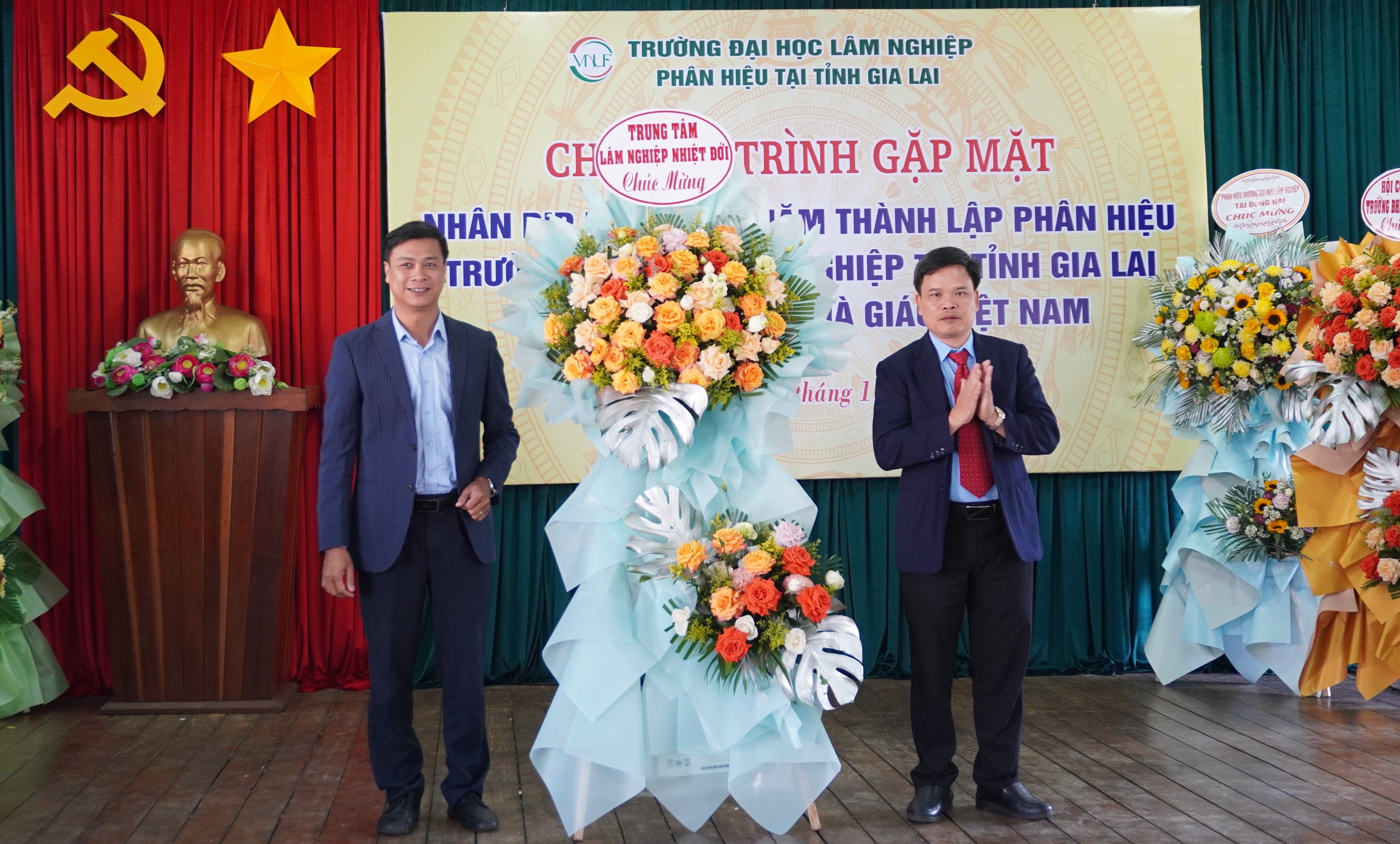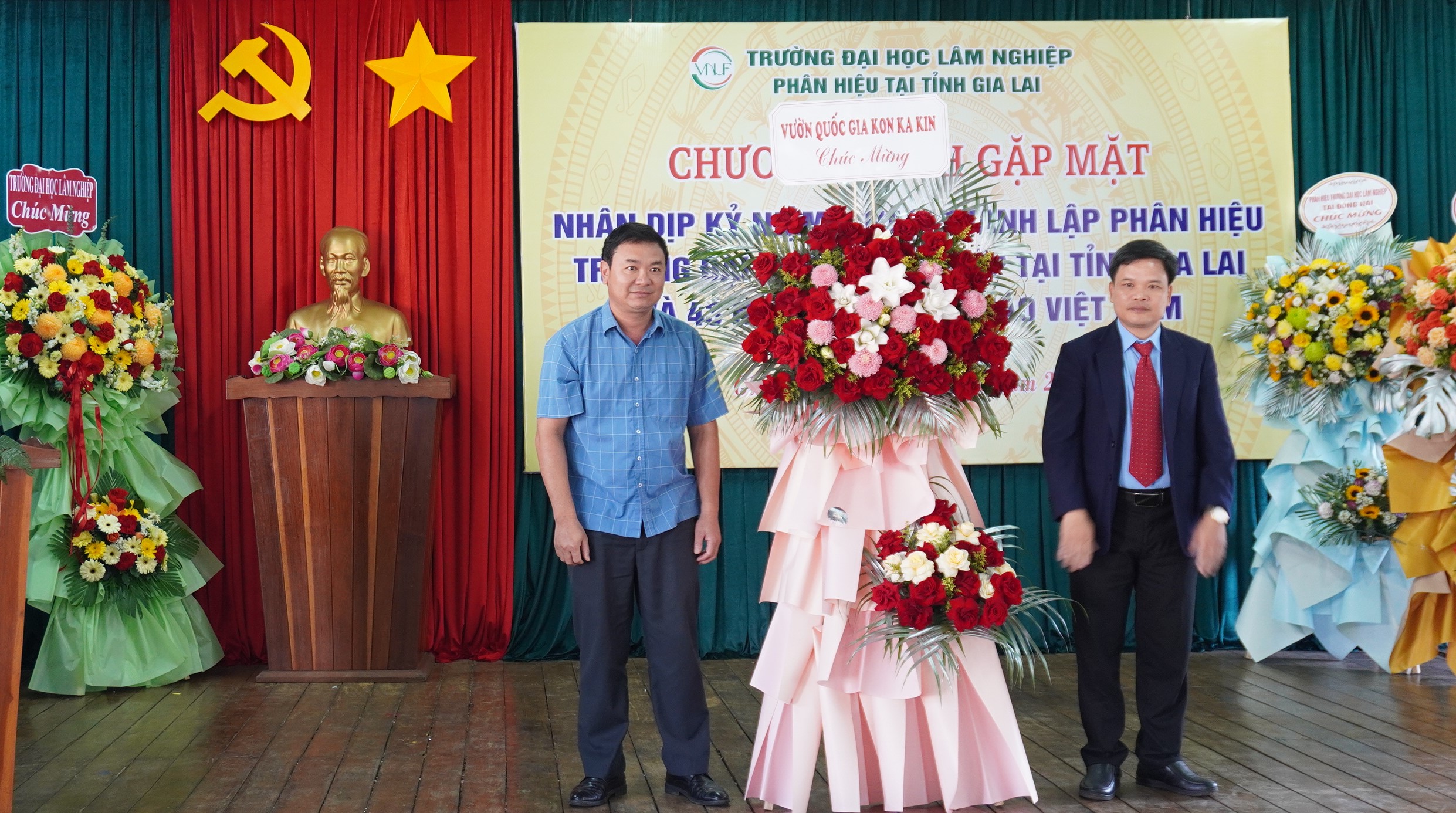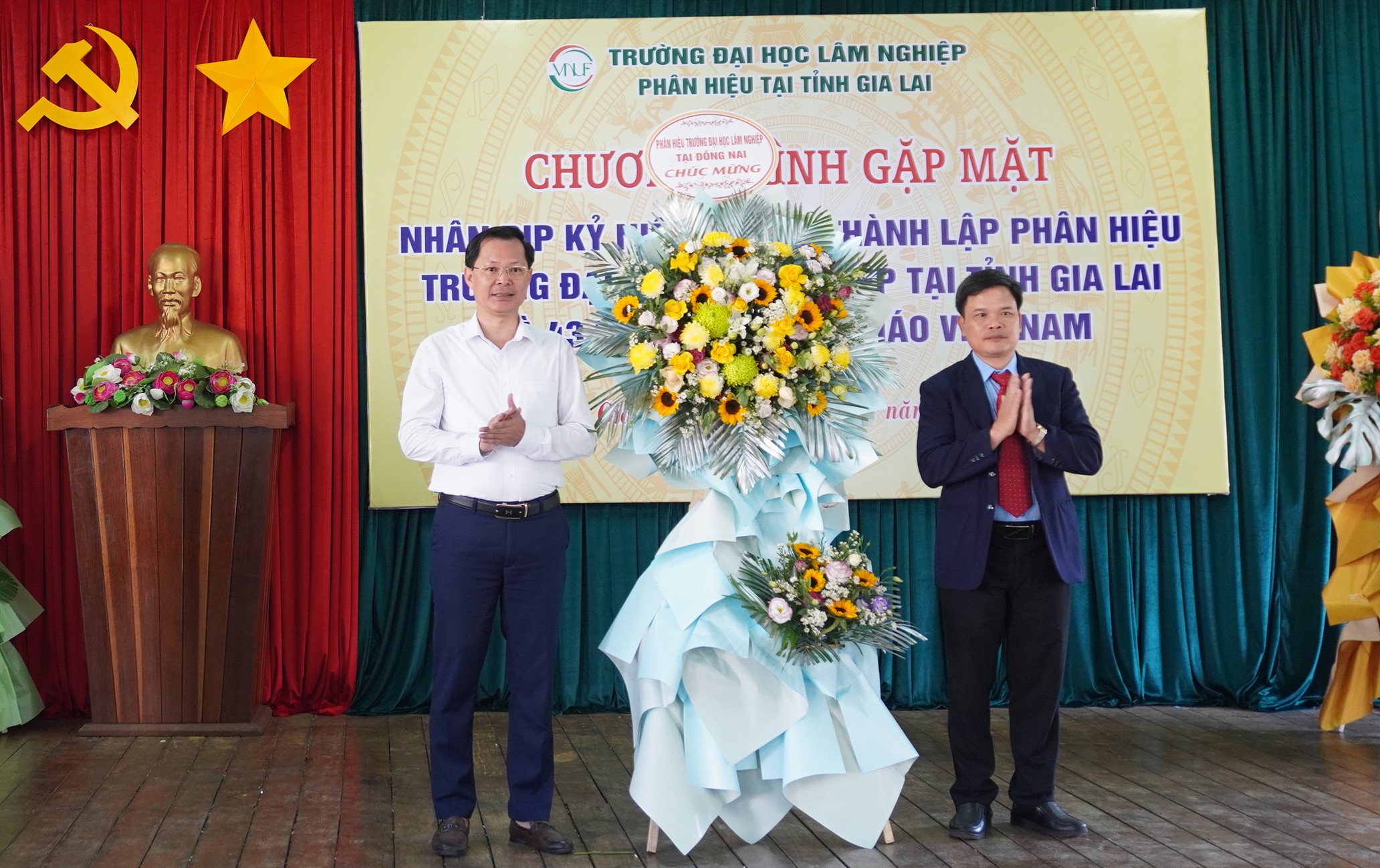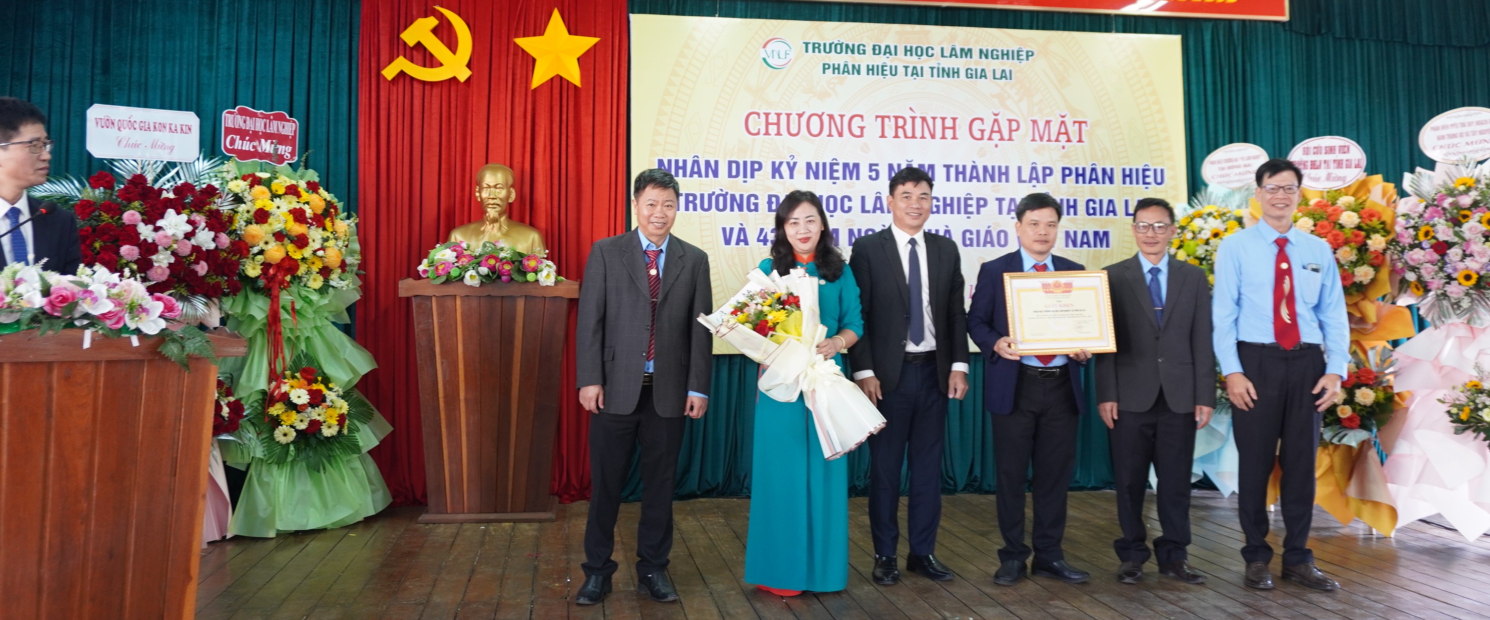 Cũng tại buổi Lễ, thay mặt Lãnh đạo Trường Đại học Lâm nghiệp, NGƯT. GS. TS. Phạm Văn Điển, Hiệu trưởng nhà trường đã tặng lẵng hoa và ủng hộ quỹ khuyến học, khuyến tài của Phân hiệu 20.000.000 đồng; Trong bài phát biểu nhân dịp Kỷ niệm Phân hiệu Trường Đại học Lâm nghiệp tại Gia Lai tròn 05 năm thành lập và chào mừng Ngày Nhà giáo Việt Nam 20/11, Thầy nhấn mạnh, trong không khí tri ân tháng Mười Một, buổi lễ trở thành dịp để nhìn lại chặng đường hình thành, phát triển và tri ân những đóng góp bền bỉ của bao thế hệ, khẳng định hành trình đi lên của Phân hiệu: từ nền tảng Trường Trung cấp Lâm nghiệp Tây Nguyên, đơn vị đã từng bước vươn lên mạnh mẽ, khẳng định vai trò đào tạo nguồn nhân lực chất lượng cao cho Tây Nguyên và Nam Trung Bộ, cũng như mở rộng hợp tác với doanh nghiệp, cơ quan quản lý và các tổ chức quốc tế. Không chỉ vậy, sự đồng hành của chính quyền, cộng đồng và cựu sinh viên đã tạo nên sức mạnh giúp Phân hiệu không ngừng lớn mạnh. Đồng thời, đây cũng là dịp để tri ân sâu sắc các thế hệ thầy cô - những người âm thầm gìn giữ và truyền lửa tri thức. Dưới sự bảo trợ của Trường Đại học Lâm nghiệp - đại học đa ngành uy tín hơn 60 năm - Phân hiệu tại tỉnh Gia Lai tiếp tục hướng đến mục tiêu đổi mới, hội nhập, trở thành trung tâm tri thức xanh của Tây Nguyên. Vì vậy, buổi lễ là lời khẳng định niềm tự hào, sự biết ơn và khát vọng vươn xa trong chặng đường mới.