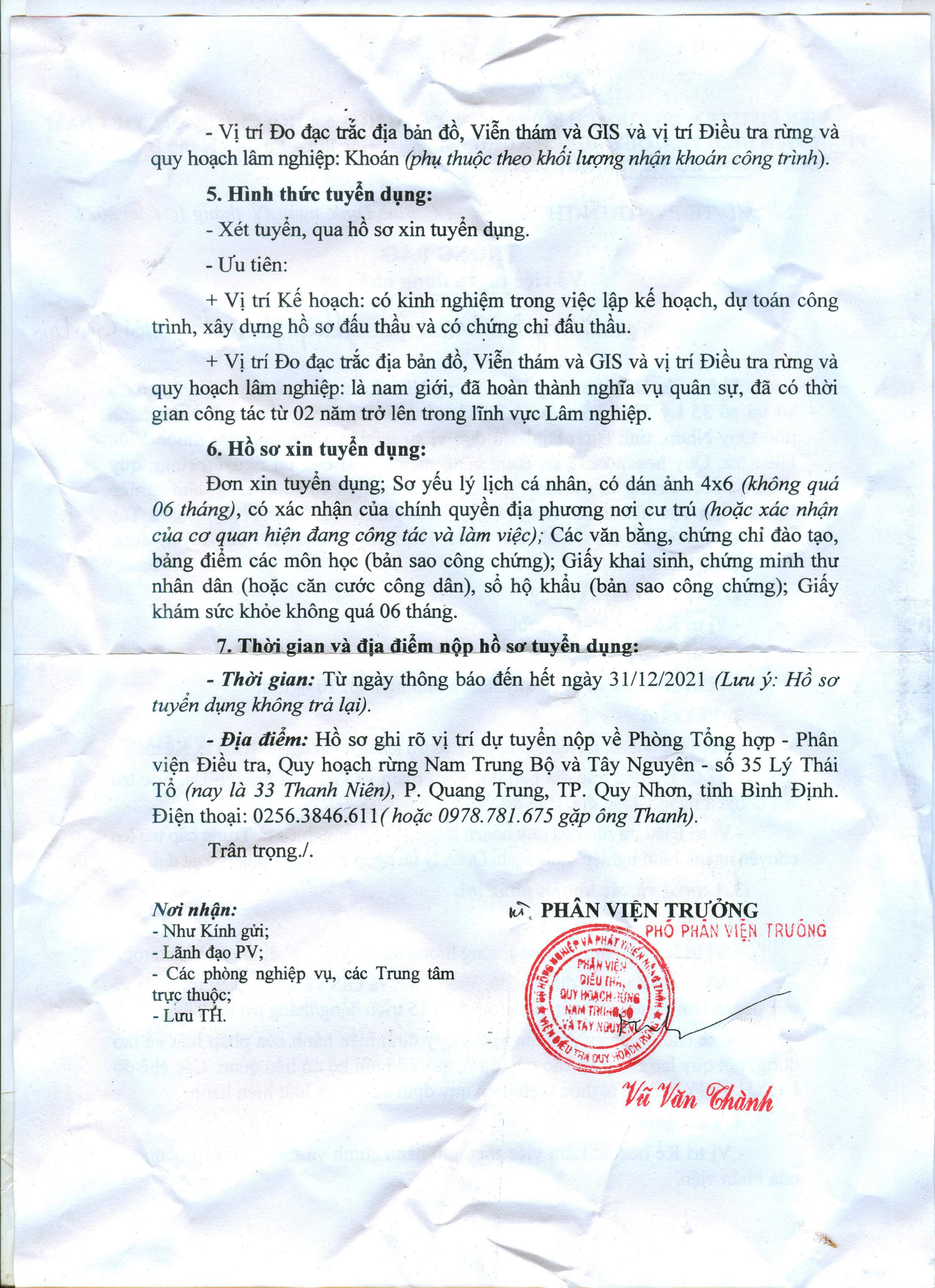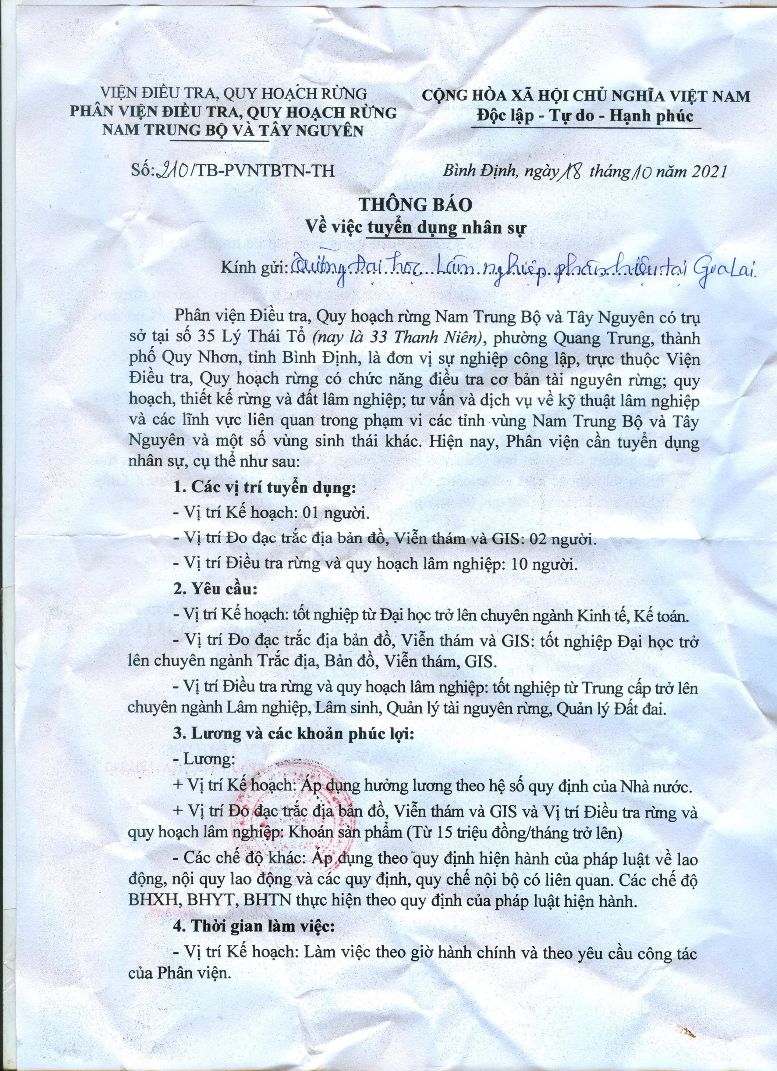 Phân viện Điều tra Quy hoạch rừng Nam Trung Bộ và Tây Nguyên tuyển dụng