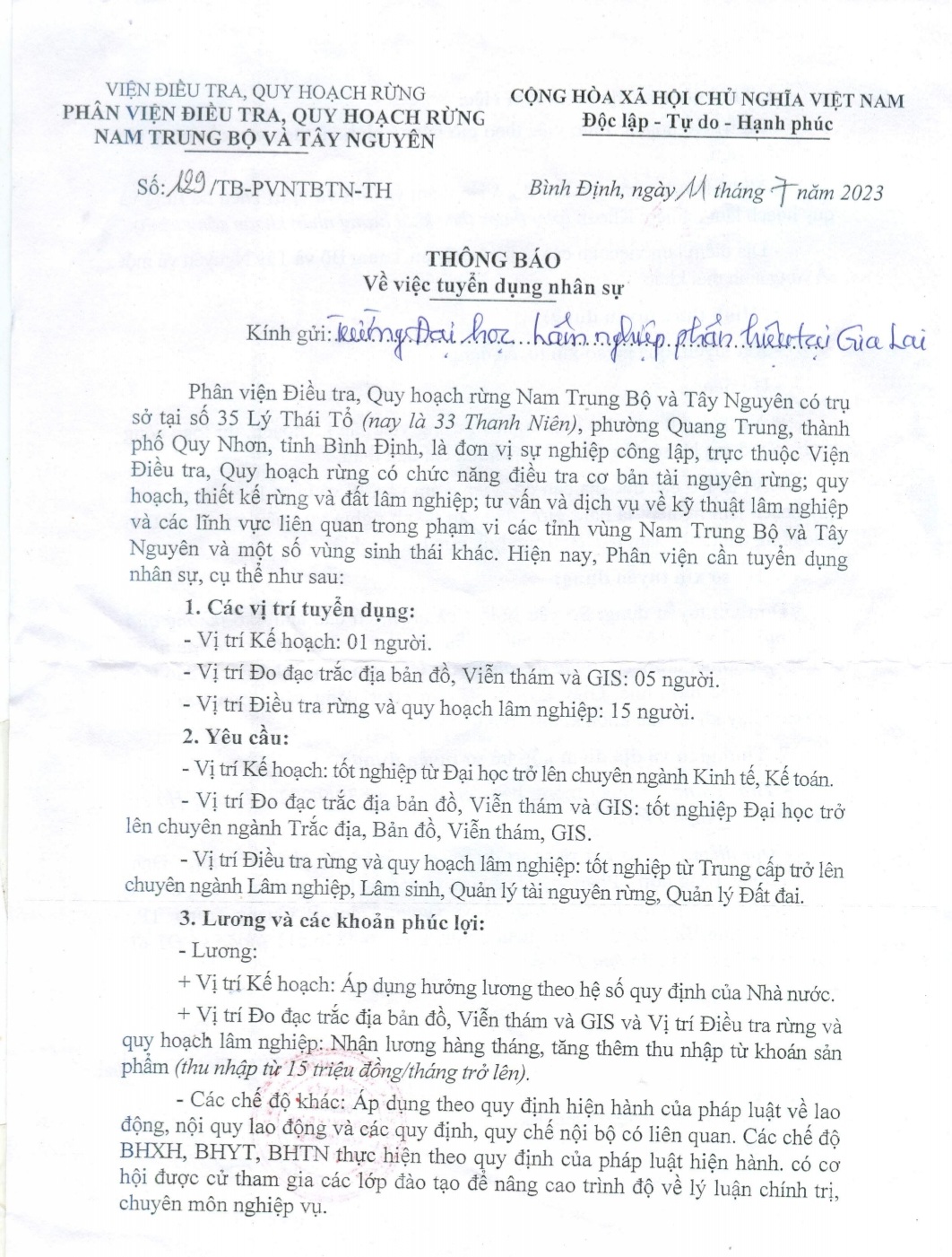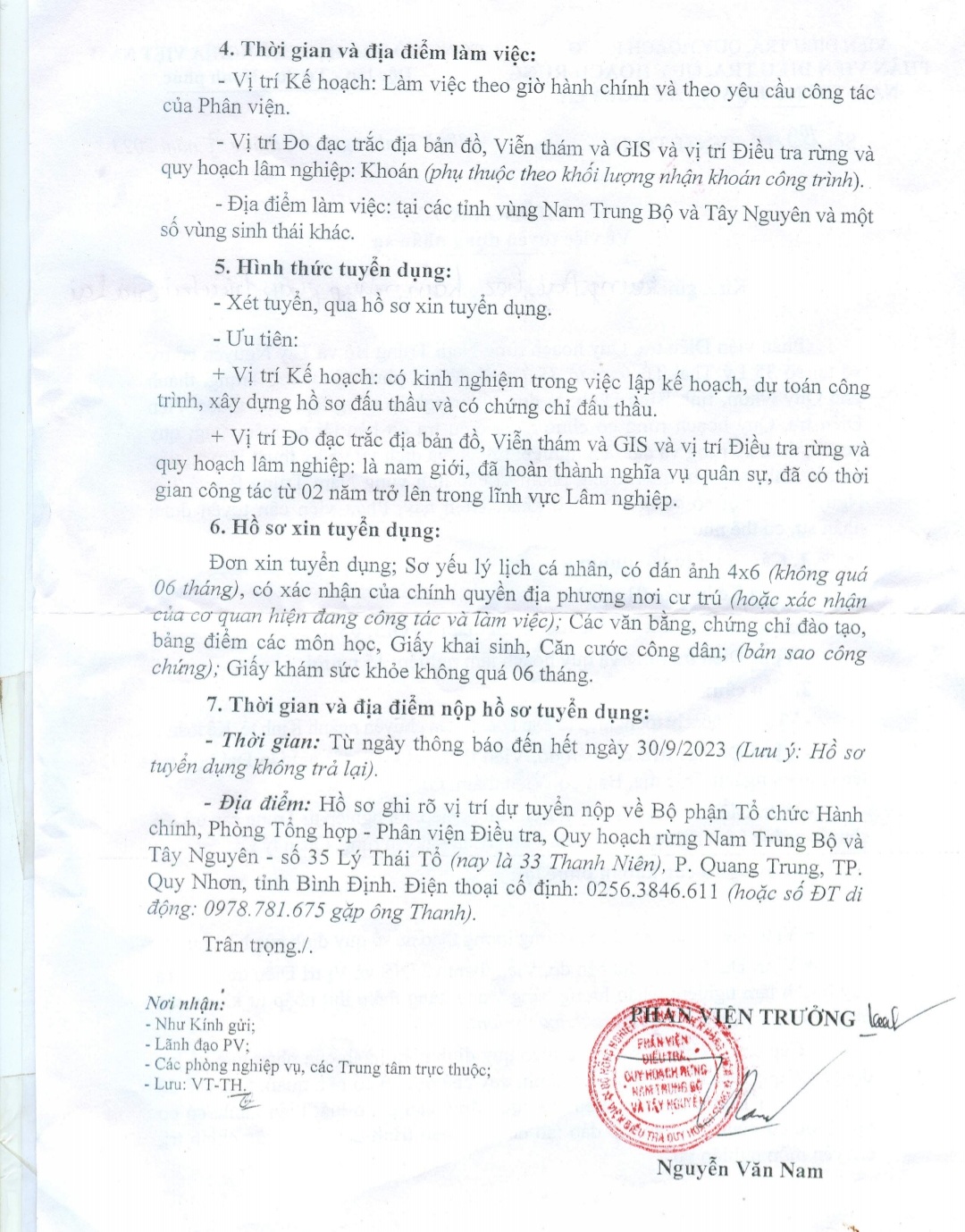 Phân viện Điều tra Quy hoạch rừng Nam Trung Bộ và Tây Nguyên thông báo tuyển dụng nhân sự