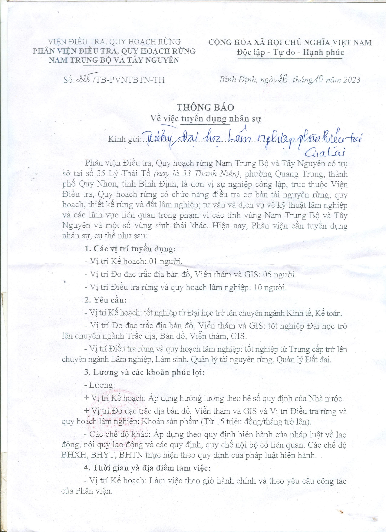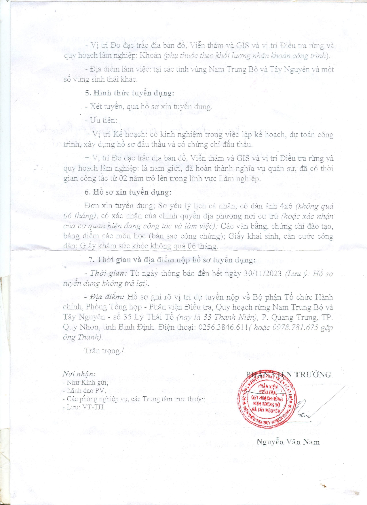 Phân viện Điều tra Quy hoạch rừng Nam Trung Bộ và Tây Nguyên thông báo tuyển dụng nhân sự năm 2023