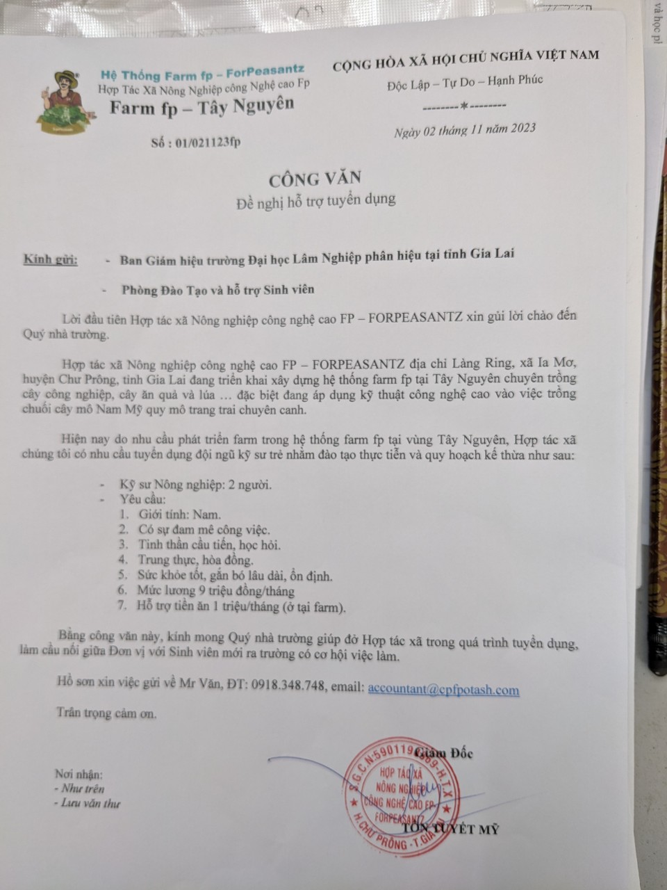 Hợp tác xã Nông nghiệp công nghệ cao FP-FORPEASANTZ tuyển dụng nhân sự