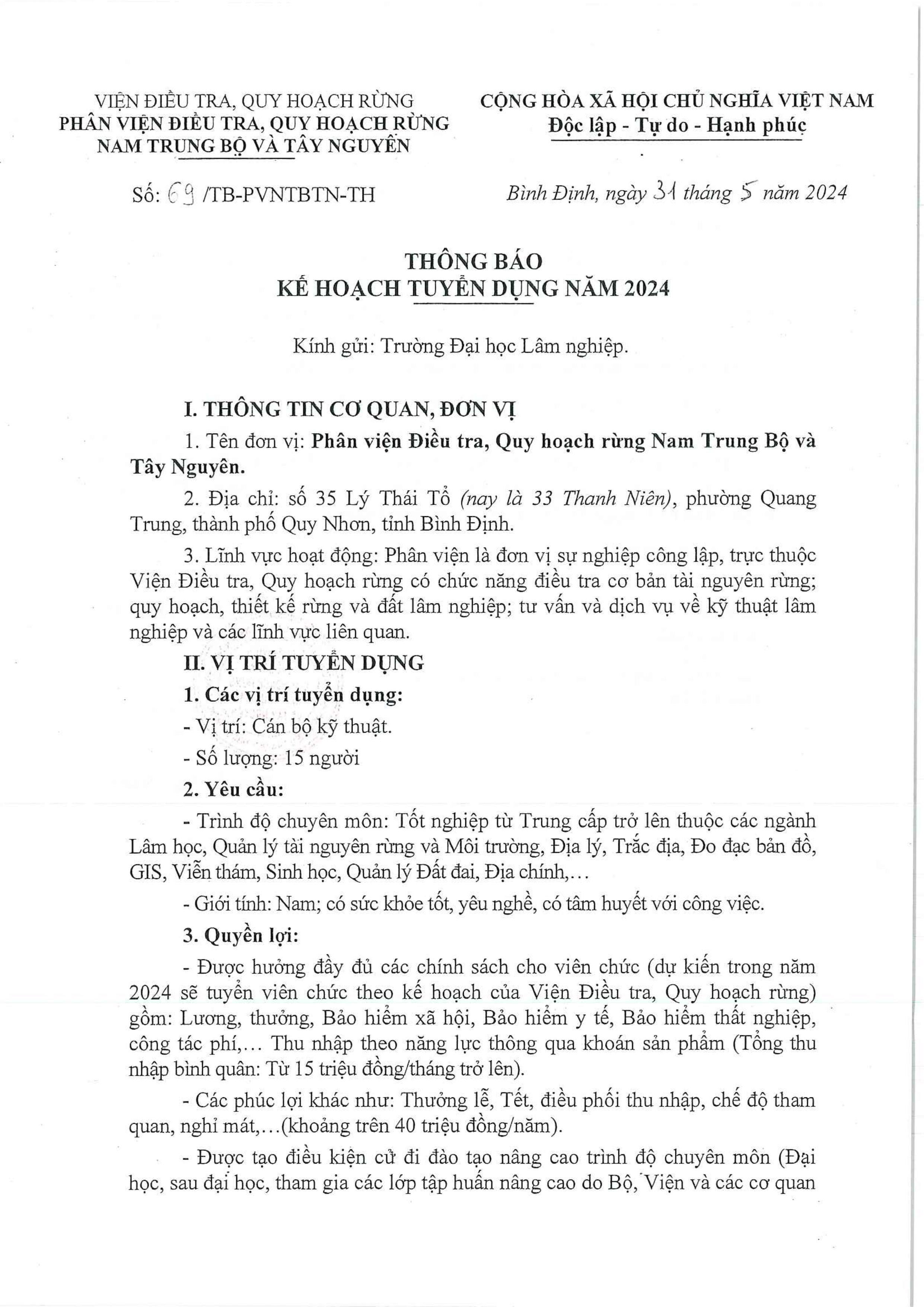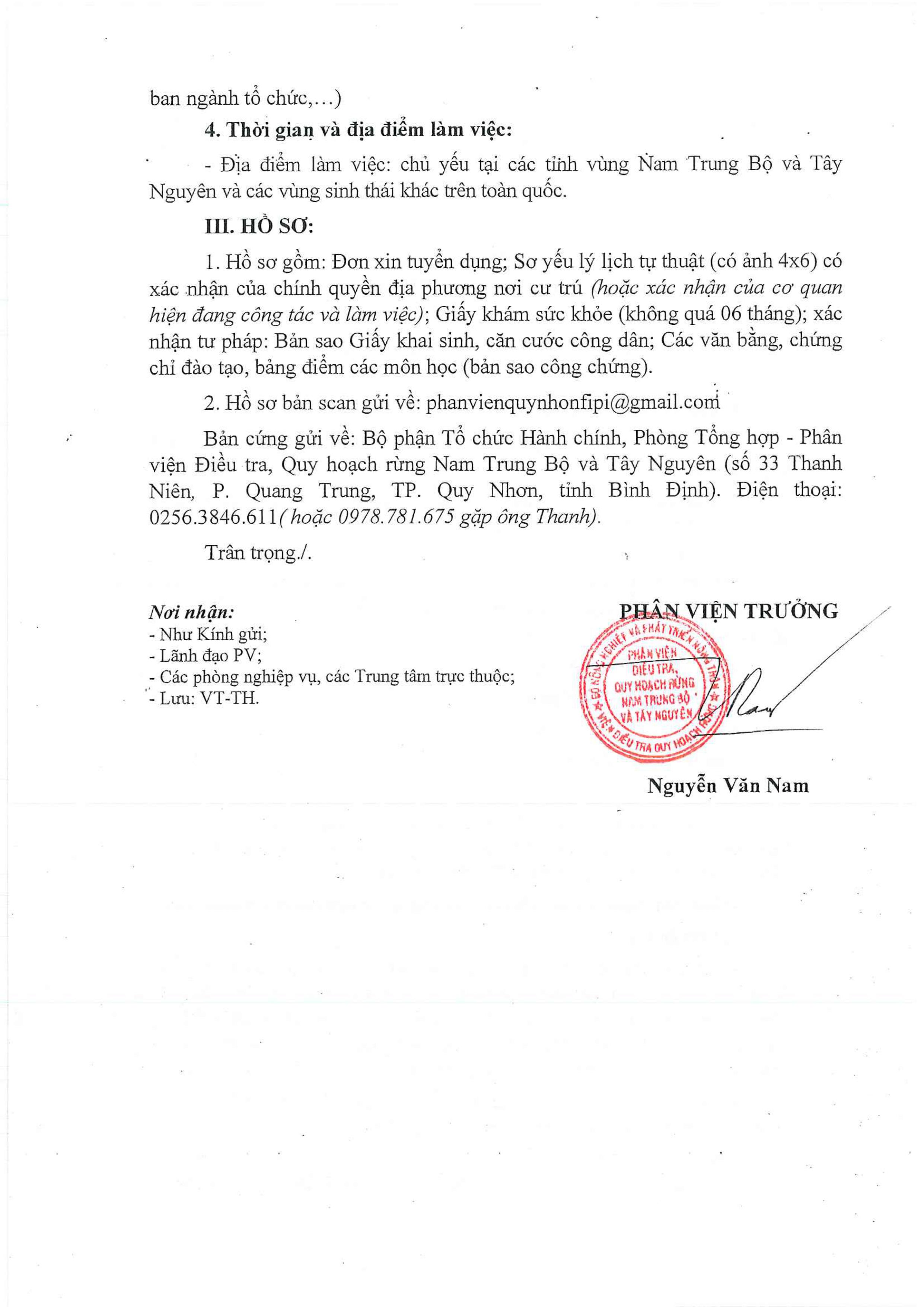 Phân viện Điều tra ,Quy hoạch rừng Nam Trung Bộ và Tây Nguyên thông báo kế hoạch tuyển dụng năm 2024